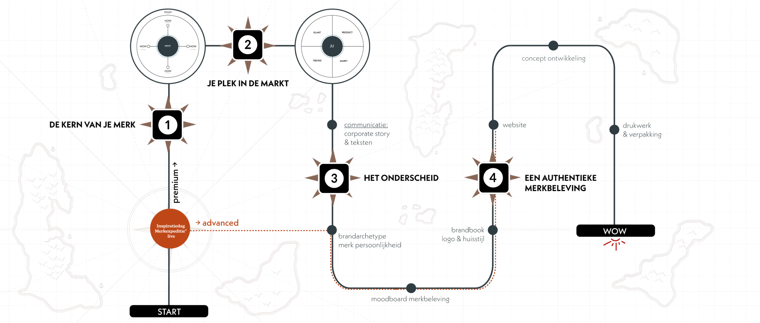 De merkexpeditie is een maatwerk programma waarbij we samen gedurende 4-6 maanden werken aan jouw merkbeleving. We bekijken alles. We gaan van jouw plek in de markt naar strategie, merkidentiteit en merkbeleving. We ontwikkelen concepten die het hart van jouw merk weerspiegelen. Om zo een unieke klantbeleving neer te zetten, zowel online als offline. Een mooie website en exclusieve stationary lijn passend bij jouw verhaal is zeker onderdeel van dit traject.